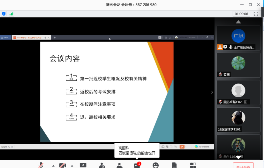 关于2020年春季学期第一批学生返校的预通知》、《关于2020年春季学期毕业班学生补(缓)考、重考安排的预通知》和《关于做好第一批返校学生相关服务工作的通知》等文件精神。从第一批返校学生概况、返校后的考试安排、在校期间注意事项和返、离校相关要求四个方面,向学院第一批返校学生传达了校、院两级关于学生返校的相关措施和管理方案。翟周老师结合返校学生的首要任务,从做好充分的考试准备、诚信应考等方面给出了具体建议和要求。高丽珠老师针对返校学生返校、考试和在校期间学习生活方面提出的具体问题,逐一解答。