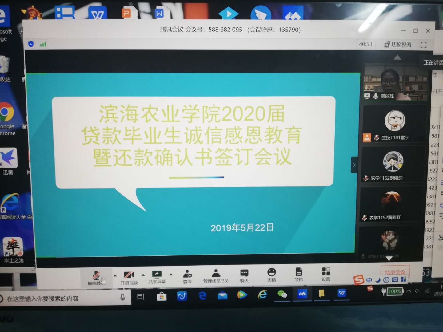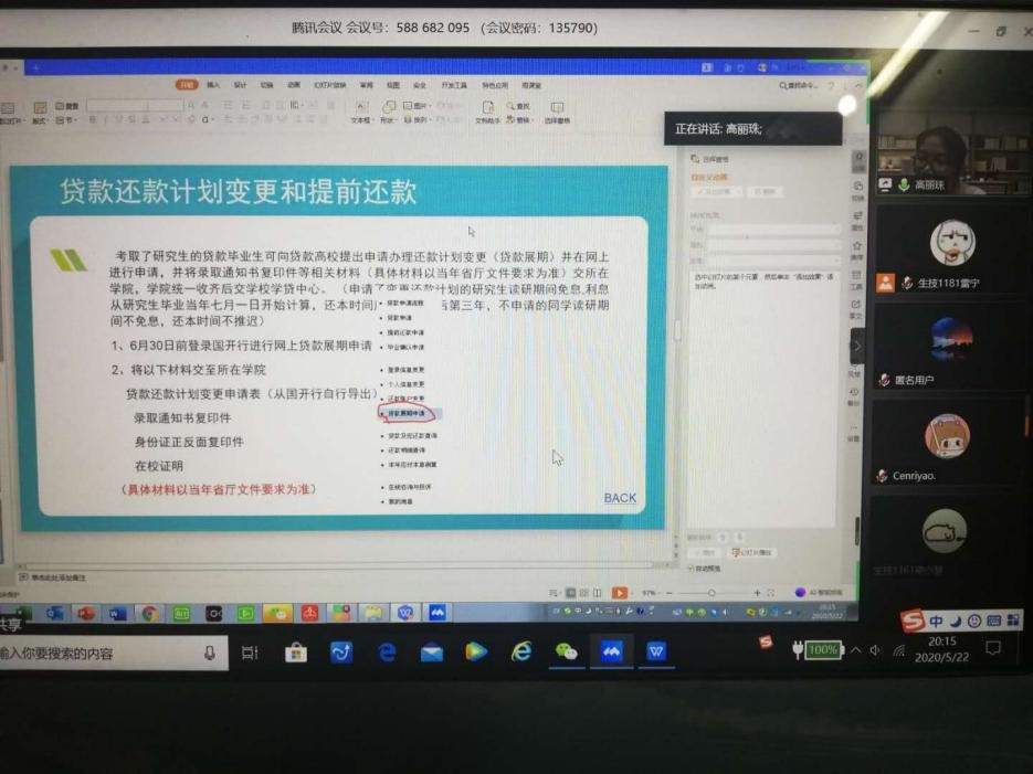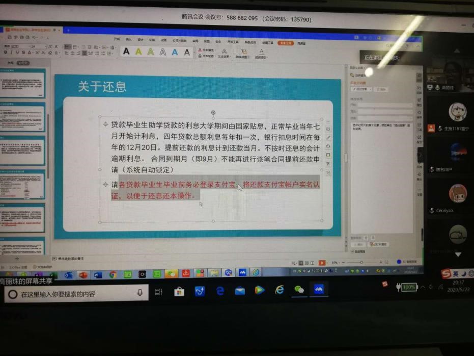召开2020届毕业生还贷工作视频会议。会议由学院辅导员高丽珠老师主持,学院团委、学生会、勤工部干部及30余名贷款毕业生参加了会议。