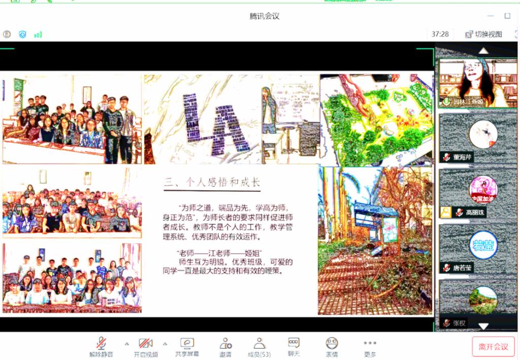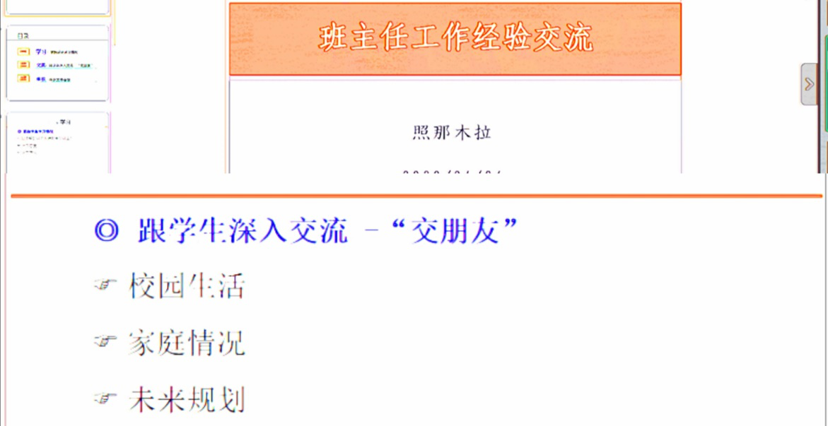2019年度十佳优秀班主任候选人江燕姬老师和优秀班主任照那木拉老师与参会老师分享他俩的班主任工作经验。江老师从“学高为师、身正为范”的教导结合到日常用“网”编织爱的家园,将李子柒文化创意融入班级管理和学生专业学习中,带领学生用微信公众号和易班平台用心营造班级形象,让学生深深爱上自己的班级;从入学的那句“老师”,到后来的“江老师”,到最后自然流露喊一辈子的“姬姐”,师生成为了彼此生命中最可爱的那个人。