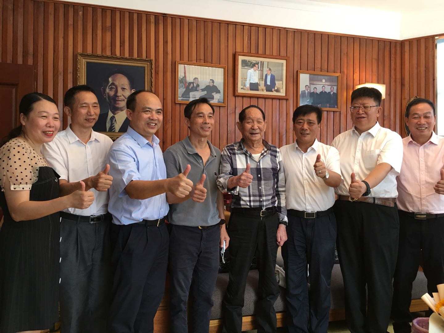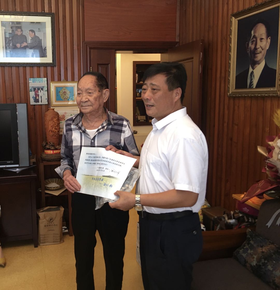 袁隆平院士在家中热情接待了教师代表一行,非常愉悦地接受了农院教师精心设计制作并由潘新祥校长亲笔签名的教师节贺卡,仔细阅鉴教师节贺词,意味深长地频频颔首。刚刚度过90岁生日的袁老师身体硬朗,精神矍铄,思路清晰,十分健谈。以他常说的“湛江是个好地方”为头,袁隆平说,国家支持大力发展海水稻,李克强总理说这是好事情。海水稻的源头在湛江,海水稻国创中心要建设好。当听到海水稻国创中心华南中心受到广东省、湛江市和我校领导高度重视,逐步推进建设,获得省、市和校的一批项目支持,发展态势良好,他连声说好,并指出,要搞杂交海水稻,要出更多新品种,在海水稻产量和品质上下真功夫。