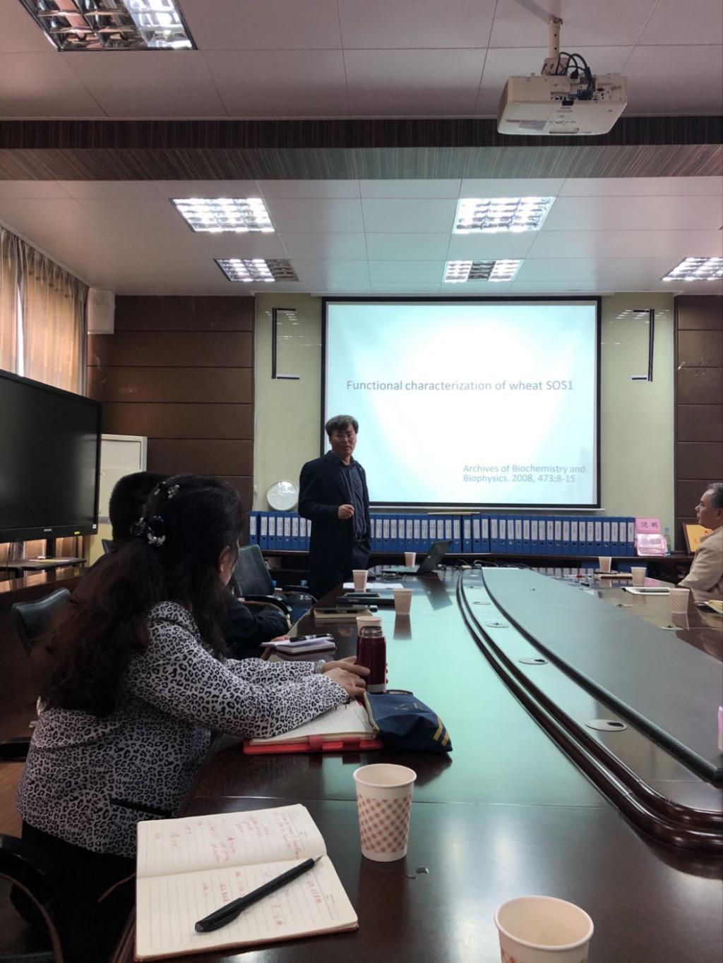 江行玉教授主要从盐碱对作物的影响、作物对盐碱的反应、耐碱作物的筛选及在国内外的推广应用、植物耐盐的作用机理等方面进行汇报,并与参会人员进行了广泛的交流。邓伟强书记总结,江行玉教授在科研理论与生产应用方面均取得了引人注目的成果,希望耐盐碱水稻团队向江教授学习,积极推进耐盐碱水稻的科研工作。
