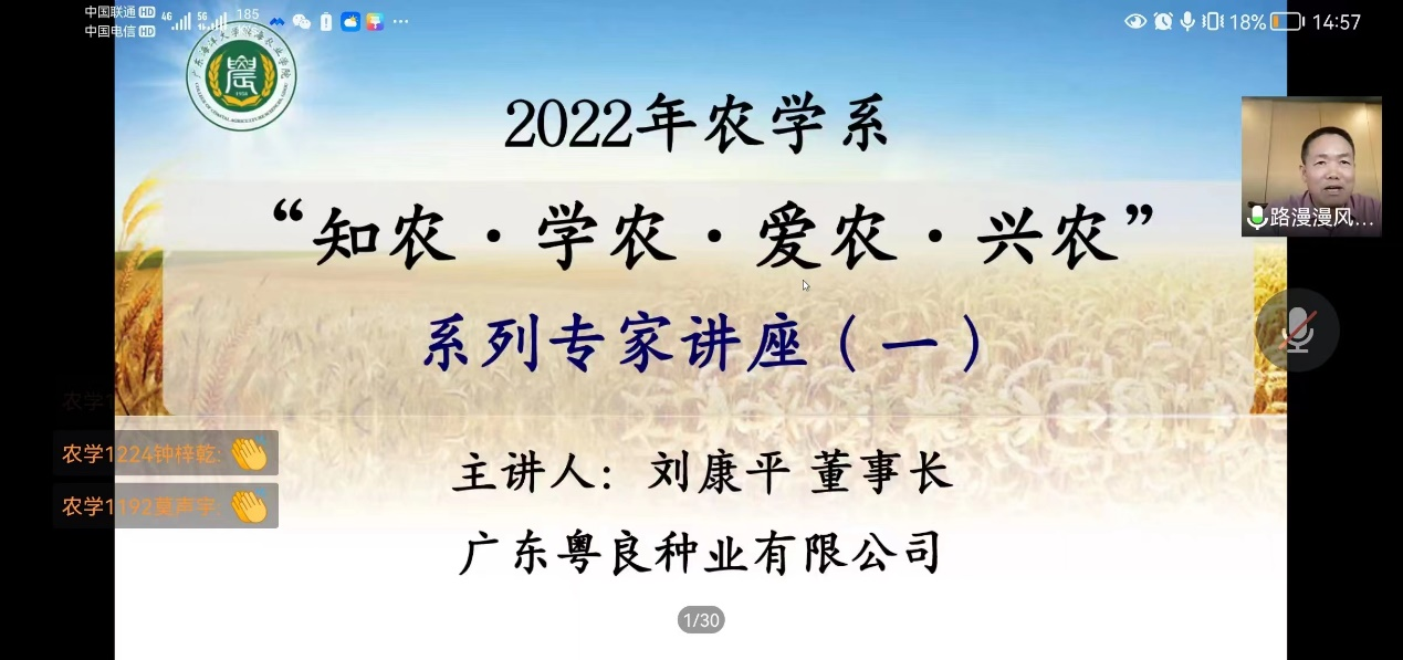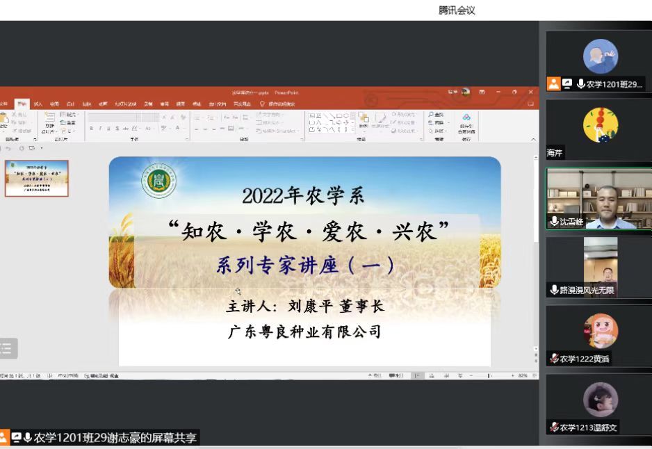 农学系邀请,广东粤良种业有限公司刘康平董事长通过网络会议的形式,开展关于“知农·学农·爱农·兴农”系列讲座。讲座由系主任沈雪峰副教授主持,辅导员、班主任和2019、2020、2021和2022级农学专业两百多名学生聆听讲座。