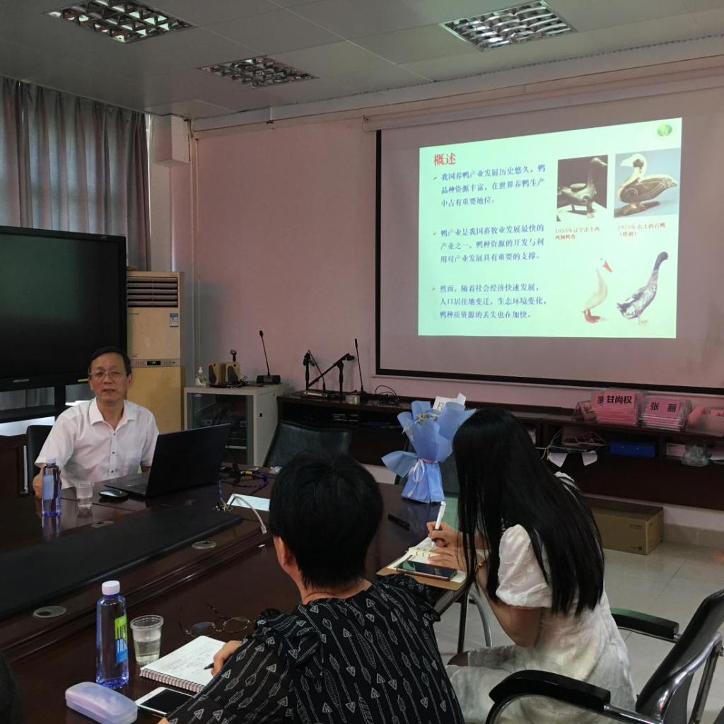 419会议室进行,会议由畜牧学科带头人赵志辉教授主持。畜牧学科教师、研究生及本科生共计30余人参加了学术报告会。刘小林教授进行了题为“我国家鸭种质资源现状及黑番鸭新品种选育”的报告。刘小林教授首先从我国鸭种质资源现状、特点以及存在的问题引入,就我国家鸭遗传资源保护和开发利用等方面进行了详细介绍,对肉鸭、蛋鸭、肝用鸭、番鸭等代表品种做了讲解。其次刘小林教授对近年来开展的黑番鸭新品种选育工作进行了交流,从黑番鸭的育种目标、选育的指标以及核心的育种技术进行了全面的讲解。刘小林教授的报告从产业发展、市场需求以及育种核心技术等多角度全面归纳总结我国和世界水禽发展的现状,此次报告会拓宽了师生的学术视野,有助于推进相关领域的交流、合作和发展。