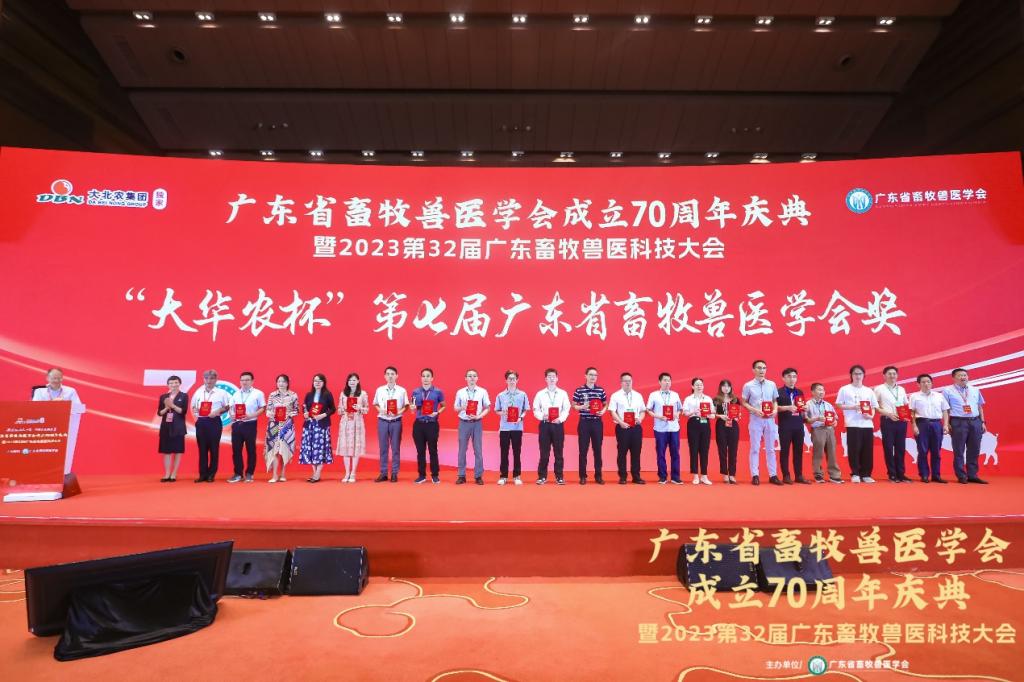 本届大会以“科技驱动七十载·创新发展铸华章”为主题,特邀来自全国的业内知名专家、养殖企业和一线科研精英等,共同探讨行业急需解决的趋势性问题。中国农业大学杨宁教授、东北农业大学单安山教授、华中农业大学晏向华教授、四川农业大学李明洲教授、中国农业科学院上海兽医研究所童光志研究员等畜牧兽医行业知名专家受邀作学术报告。我校尹福泉教授受邀在动物营养与饲料科技论坛作了题为“海洋活性多糖的营养生理功能及调控机制”的学术报告;郭富城博士受邀在水禽产业高质量发展论坛作了“跨种感染人的H5Nx禽流感病毒的适应性进化研究”的学术报告;刘文超副教授指导的研究生王垚垚在研究生论坛作了题为“基于Ⅱ相解毒酶途径及肠-肝轴研究纳米硒-浒苔多糖对AFB1诱导肉鸡肝脏损伤的保护作用”的学术报告。三个报告介绍了我校畜牧学科(畜牧和兽医领域)的部分研究成果,得到与会专家的广泛认可。为奖励对全省畜牧兽医行业做出巨大贡献的杰出人才,本次会议还举行了学会成立70周年和“大华农杯”颁奖仪式。经过专家评审,我校畜牧学科带头人赵志辉教授荣获“大华农杯”第七届广东省畜牧兽医学会“杰出科技工作者”称号,动物医学系主任巨向红教授荣获广东省畜牧兽医学会成立70周年“青年科技奖”。