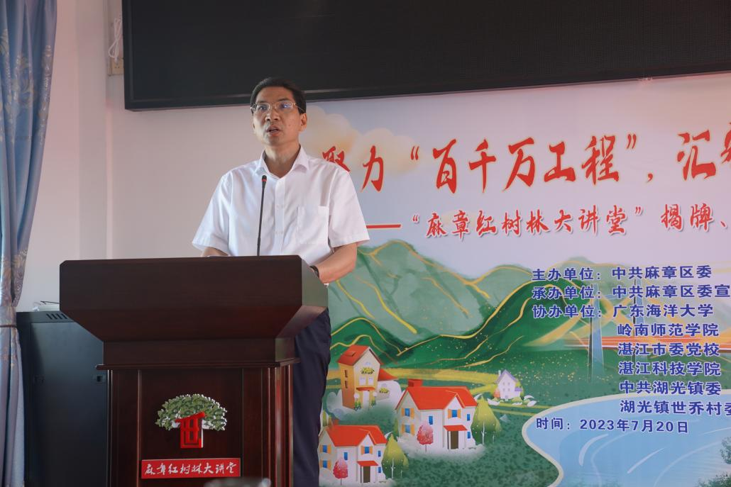 林晓敏副书记对麻章“红树林大讲堂”开讲表示祝贺,并对麻章区委、区政府对辖区高校的支持和保障表示感谢。阐述“百县千镇万村高质量发展工程”是省委部署的重大任务,校地合作、高校与区域协同发展具有重要性。我校与麻章区共建“四个一”:一站一带一堂一队,即一个“百千万工程”服务站,一个校地对接服务站,一条“湖光乡韵”乡村振兴示范带,一个红树林大讲堂,一个“国宝”讲解队,汇智助力麻章区高质量发展,将发挥重要作用。