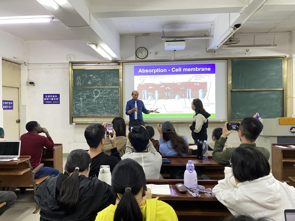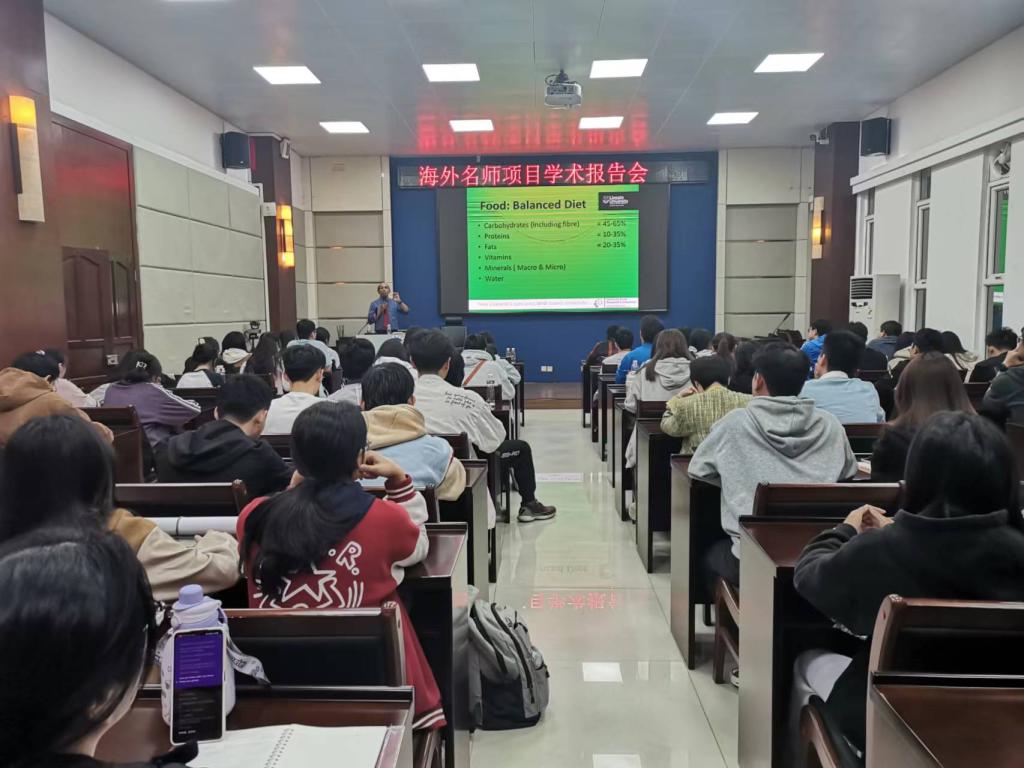 师生作学术报告。Ravi Gooneratne的学术报告以《Food Safety & Security: Plant Toxins》为题,他从肠道微生物、食品安全与保障、植物饲料毒素等方面作了详细介绍。Abd EI-Aty的学术报告以《Advancements in natural drug development: A spotlight on inflammatory bowel disease》为题,聚焦炎症性肠病,重点介绍了治疗炎症性肠病的天然药物的优势、效益、抗炎机制、免疫调节作用及药物开发的最新研究进展。动物科学系王润莲教授、学工办翟周老师、动物医学系和动物科学系部分青年教师、研究生及“卓越班”学生约150参加会议,报告会由动物医学系主任巨向红教授主持。