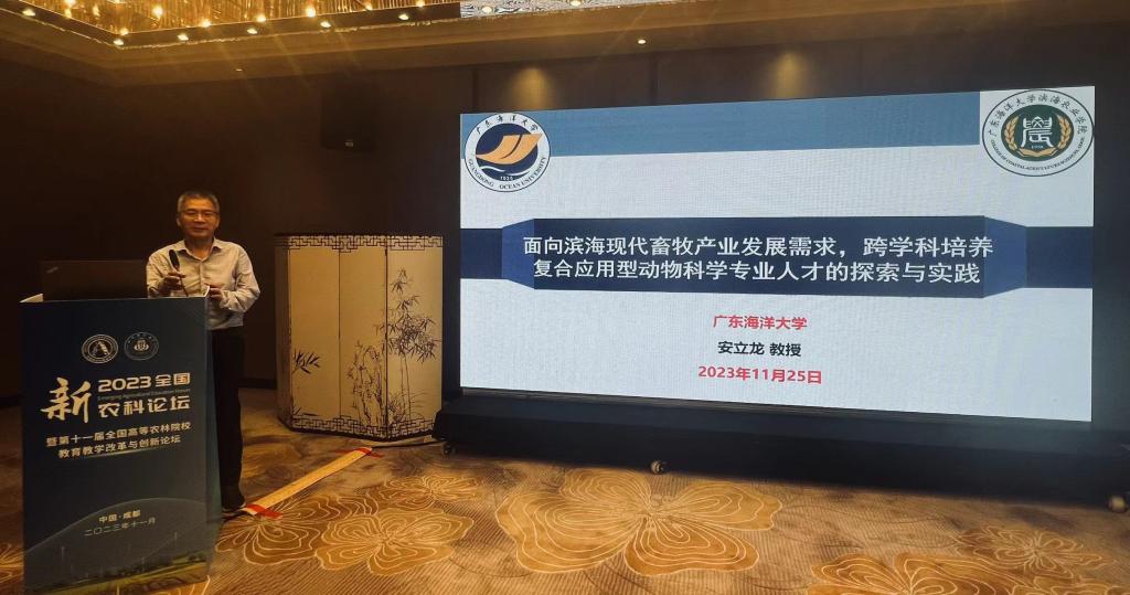 我校教育部新农科改革与实践项目负责人、国家一流专业动物科学专业负责人安立龙教授、动物科学系系主任尹福泉教授和青年教师马健博士出席了本次论坛。安立龙教授应邀作了题为“面向滨海现代畜牧产业发展需求,跨学科培养复合应用型动物科学专业人才的探索与实践”的大会报告,介绍了我校动物科学专业积极应对畜牧业工业化、生态化、数字化、产业化、规模化发展挑战,立足湛江滨海现代畜牧业高质量发展对人才培养的需求,充分利用我校综合性大学多学科优势,跨学科培养“一专多能”复合应用型人才的探索与实践。