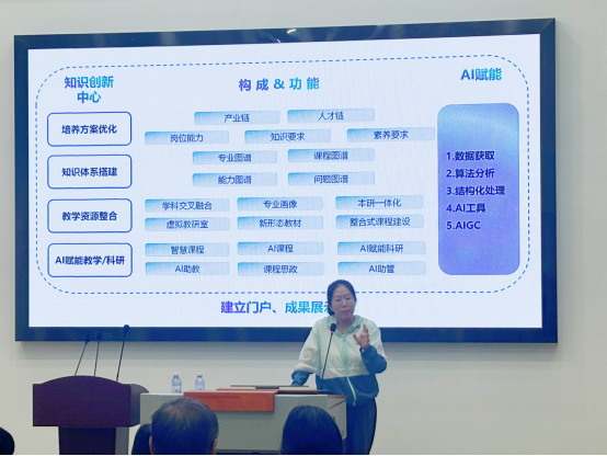 李潇围绕“培养方案优化”、“知识体系搭建”、“教学资源整合”和“AI赋能教学/科研”四个方面详细介绍了人工智能在专业建设、人才培养模式改革和提升教学质量中的作用和应用,并结合已建成的课程范例讲解了什么是智慧课程和AI课程,以及如何建设智慧课程和AI课程。讲座结束后,与会教师与李潇就人工智能如何赋能教学质量提升和课程建设进行了互动交流。