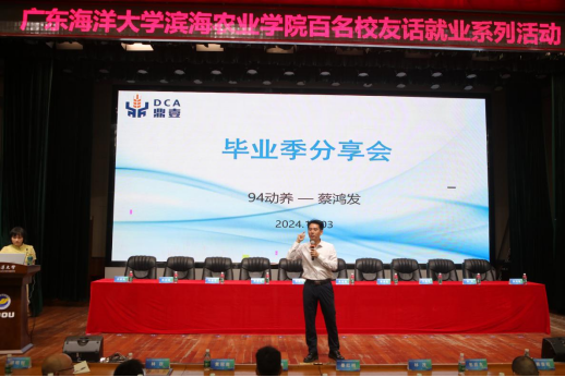会议上,广东雅琪生物科技股份有限公司董事长陈训银、茂名市鼎壹饲料有限公司董事长蔡鸿发、广垦牧原(湛江)公司副总经理钟日聪等校友倾囊相授,分别讲述他们的求职创业经历,分析了目前行业的现状、前景和用人需求,希望师弟师妹们在校期间要把握住机会,提升自己各方面学习能力,树立正确的三观,转变就业理念,终身学习,努力成为行业、企业和社会领军人才。