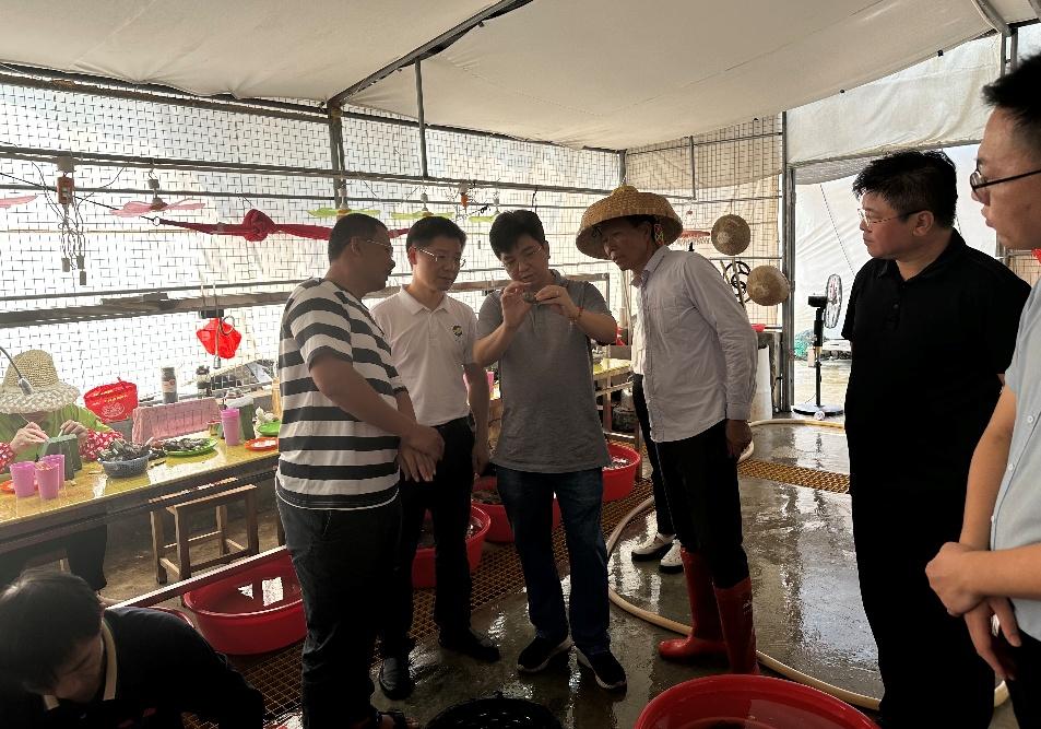 会后,在西连镇镇长陈杭、镇党委副书记劳良强以及驻镇帮镇扶村工作队队长肖永的陪同下,科技特派员团队一行深入珍珠养殖产业以及东风螺生态养殖示范基地实地调研。在珍珠贝插核作业区,水产养殖专家王庆恒教授手持样本贝为养殖户现场演示“插核”手术操作规范,从贝体切口定位到术后消毒养护,逐一讲解。随后,在东风螺养殖池畔,马驿院长与陈杭镇长共同为台湾女优