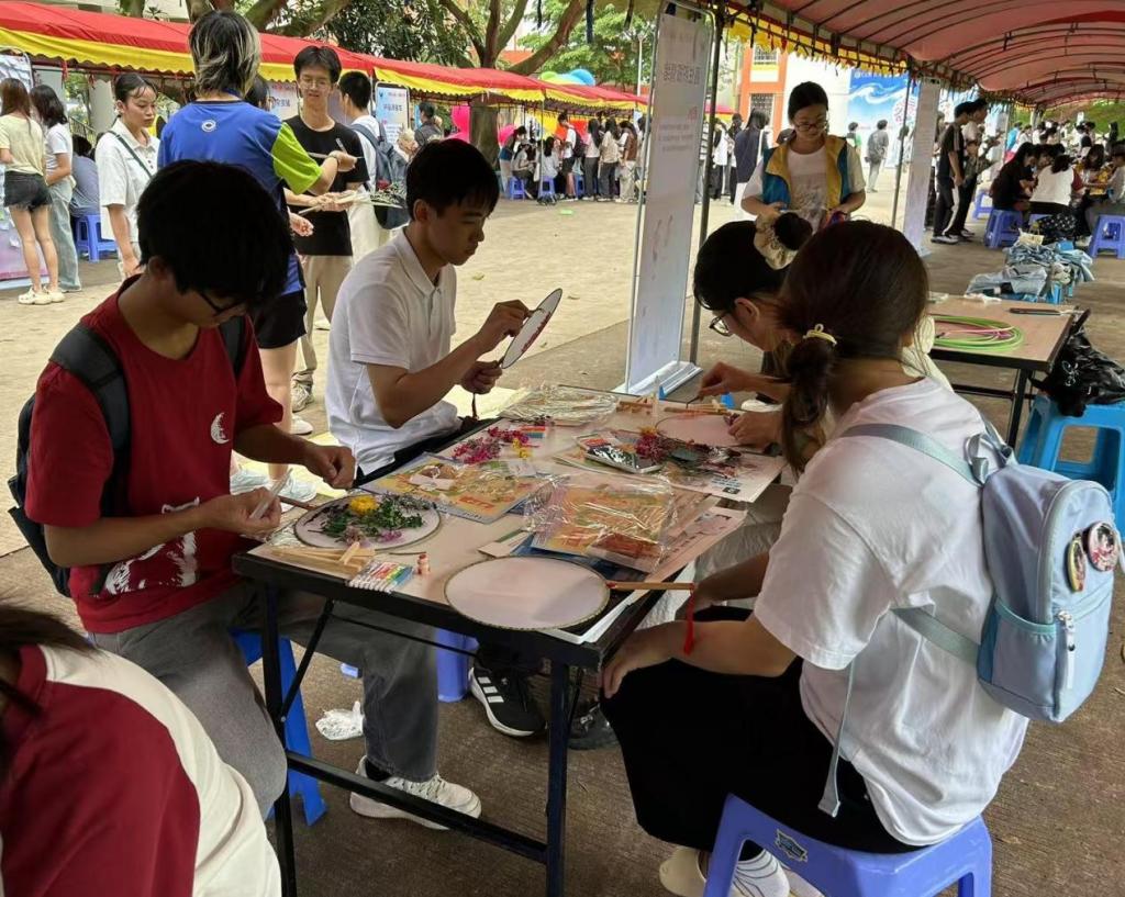 指尖艺术:永生花团扇定格情绪之美。在“永生花团扇”制作区,干花与古典团扇的邂逅,让传统美学与心理疗愈完美融合。参与者以粉白玫瑰、翠绿蕨叶为笔,在素白扇面上勾勒出内心的情感画卷。指导老师现场引导:“每一片花瓣的布局都是情绪的投射,无需刻意追求完美,只需跟随本心。”一位同学捧着自己完成的团扇感慨道:“原来疗愈可以如此诗意,手中的花仿佛开在了心里。”