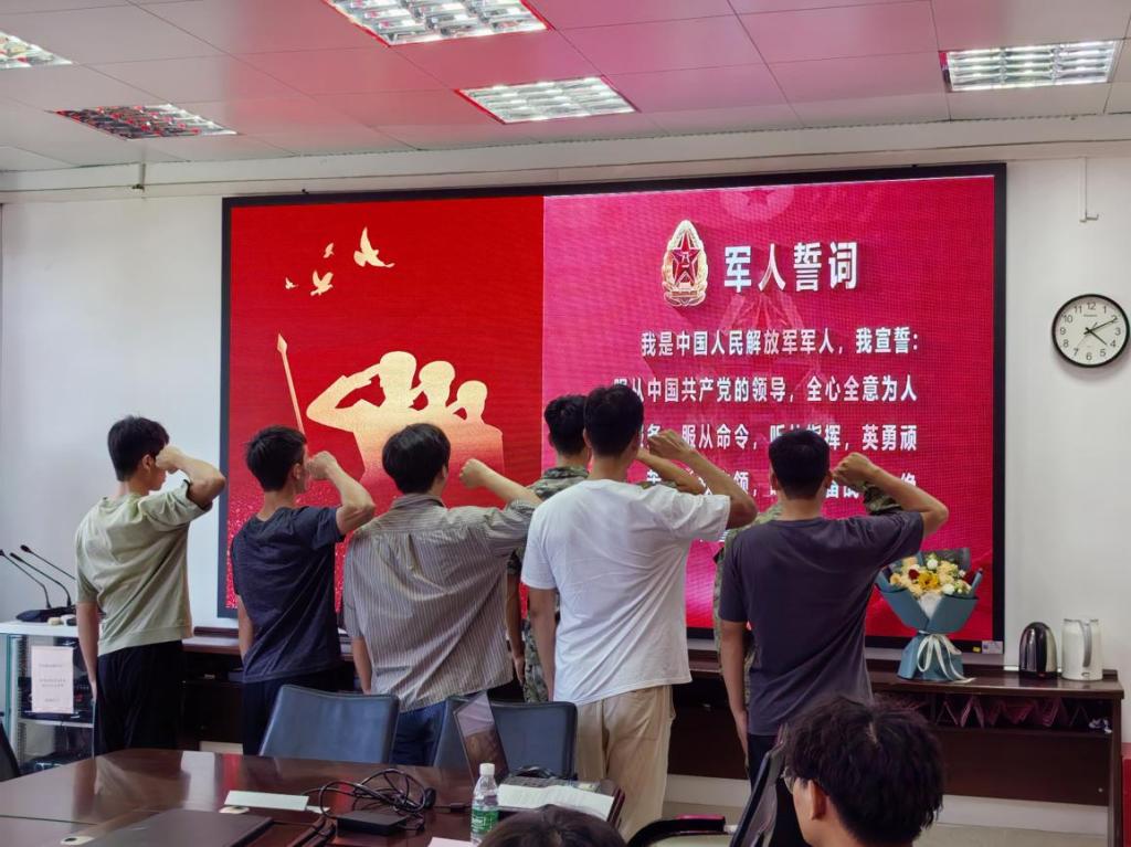 仪式现场,退役班班长梁庭珲带领刘志远和退役在校生庄严宣读军人誓词,铿锵誓言回荡在整个会场。学院领导为刘志远佩戴"光荣入伍"绶带,并赠送精心准备的纪念品。与会同学纷纷上前与刘志远拥抱话别,叮嘱他在部队保重身体、奋勇争先,温馨场面令人动容。