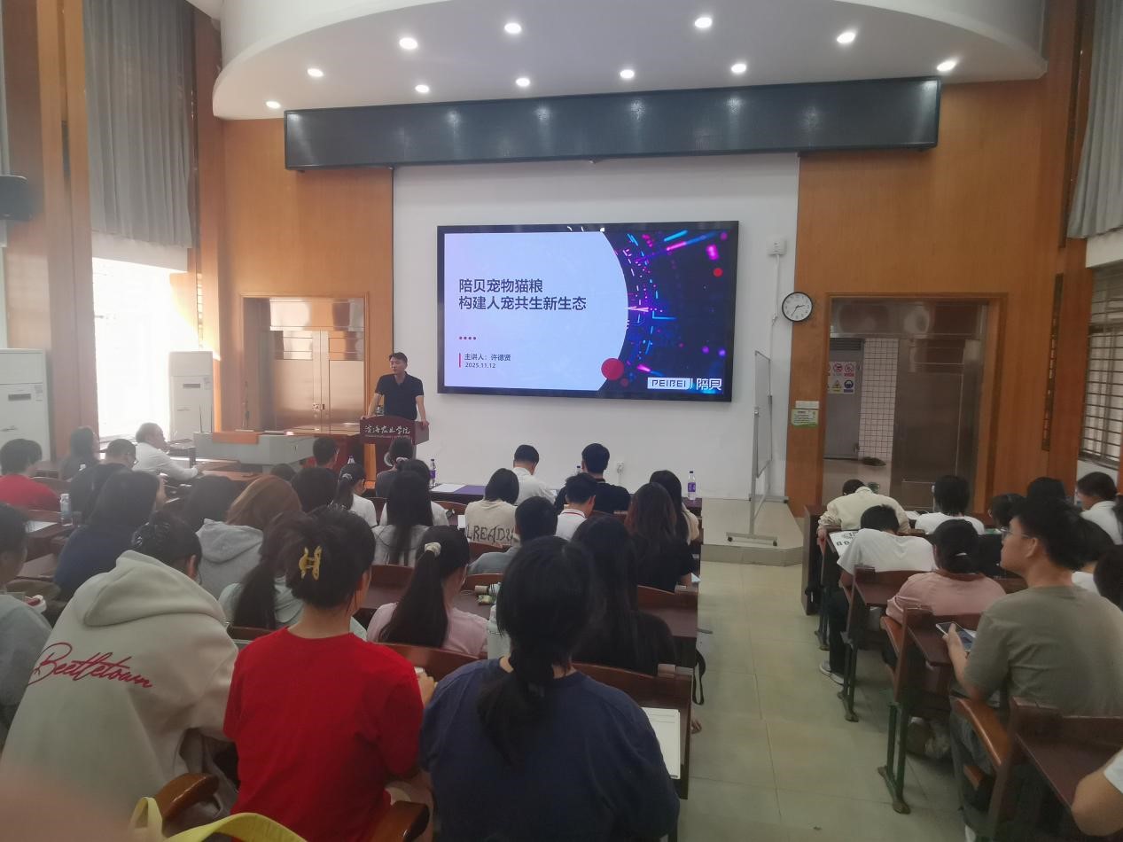 1998届动物营养与饲料加工专业校友、“陪贝”宠物食品品牌创始人兼总经理许德贤,以《陪贝宠物猫粮,构建人宠共生新生态》为题展开分享。他结合自身创业经历,强调“人宠共生”理念下产品安全与情感价值的双重追求。许德贤回顾了在母校的求学及职场经历,勉励学弟学妹们既要夯实专业基础,也要敏锐捕捉市场需求变化,在细分领域打造核心竞争力。