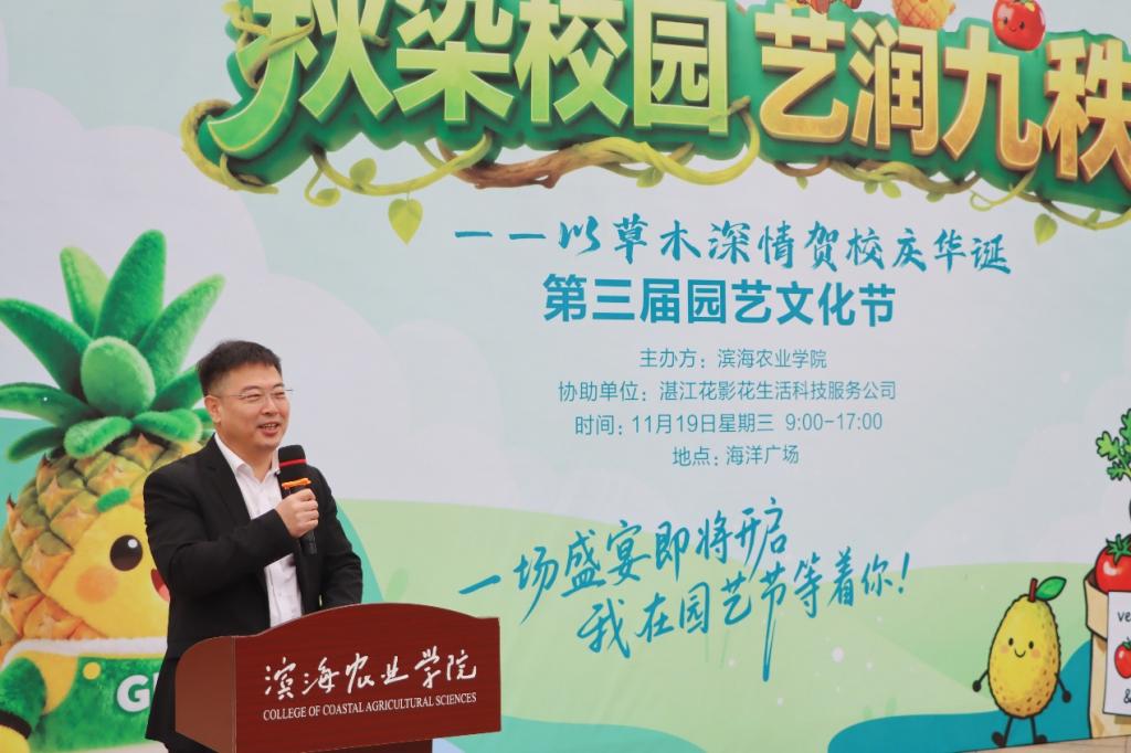 第三届园艺文化节在湖光校区海洋广场举行。校党委书记杨洲,原湛江市科协主席、校友肖斌,湛江花影花生活科技服务公司董事长、校友何敏桢,台湾女优