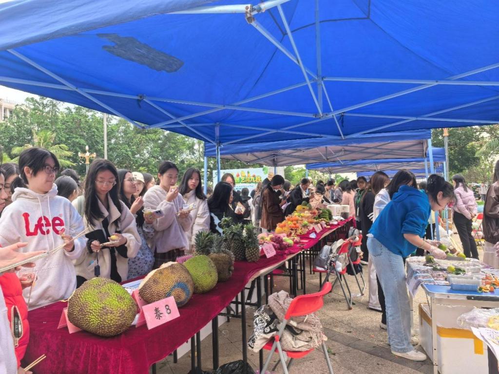 本届文化节匠心独运,设置了“有看、可玩、能尝”的多元化体验区,让师生们沉浸式感受园艺的无限魅力。在科普展区,波罗蜜、番茄、火龙果等一批我校自主选育的新品种及科研成果集中亮相,配合详实的讲解,充分展现了学校在热带园艺领域的深厚积淀与创新实力。智慧园艺、立体水培等前沿技术的展示,则描绘出现代农业的未来图景。水果品鉴区与蔬菜沙拉制作区人头攒动,新鲜的波罗蜜、番茄、火龙果等优品让师生们赞不绝口,实现了从“田间”到“舌尖”的美妙连接。“元气水果套圈派对”、“籽语寻踪”、“植物密码传递”等互动游戏,将园艺知识巧妙融入其中,欢声笑语不断,成为活动现场最具人气的焦点。落叶风铃、种子炸弹、干花书签、小花束制作等DIY活动,让同学们在动手创造中感受自然之美,一件件独具匠心的作品,承载着对美好生活的热爱与向往。精心布置的园艺主题秋千、繁花拱门、梦幻花伞以及意境深远的富贵竹盆景等展示区,构成了一系列绝美的打卡点,师生们纷纷驻足拍照,留下绚丽的记忆。