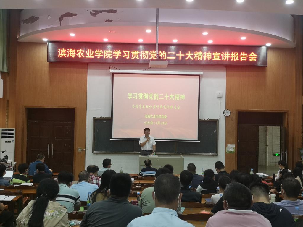 在湖光校区兴农楼109室召开学习贯彻党的二十大精神宣讲报告会,由学校党委理论宣讲团成员李林杰博士主讲,学院党委副书记、院长(主持党委工作)郑殿峰主持会议,全院教职工、学生代表等115人参加。